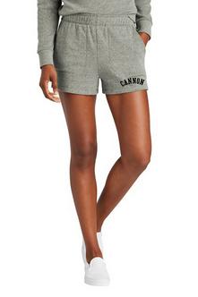 Women's grey frost 7-ounce tri-fleece shorts have mitered front pockets and elastic waistband with interior drawcord. Fabric is 54/40/6 polyester/combed ring spun cotton/rayon.