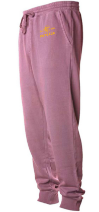 Pigment dyed unisex fleece sweatpants have side pockets and a back pocket. 9 ounces, 80/20 ring spun cotton/polyester. Ribbed cuffs. Embroidered.