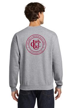 Gildan brand sport grey crewneck sweatshirt has imprints on both sides. Material is 8-ounce, 50/50 cotton/polyester.
