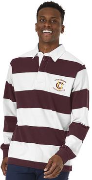 Unisex style 100% cotton jersey rugby shirt features a heavy duty white twill placket that conceals rubber buttons. Rib knit cuffs.