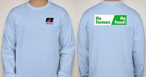 The 6 oz. 100% cotton unisex long-sleeve shirts feature the "No Farmers,
